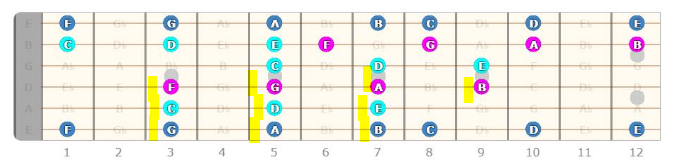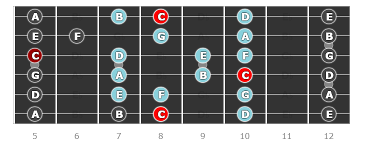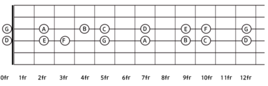 - 옥타브(8도): 두 줄과 세줄 위의 같은 음을 찾아내는 옥타브 패턴을 익히면 지판 전체를 하나의 망으로 연결할 수 있습니다.